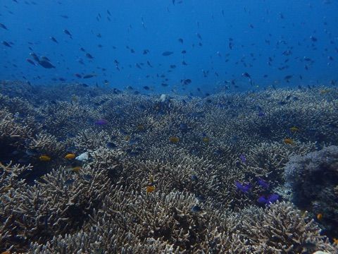 透明度は20メートルくらい、流れ少々、水温26.8℃くらいでした。