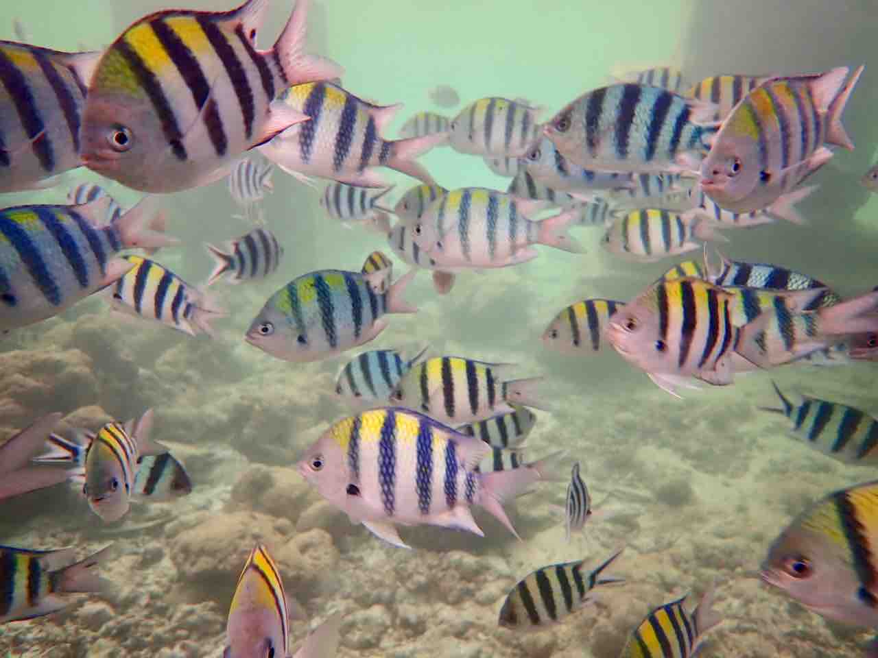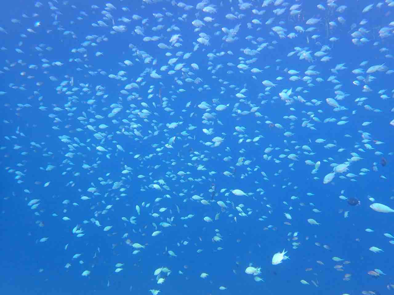 桟橋下はオヤビッチャ、ロクセンスズメダイがお出迎え。