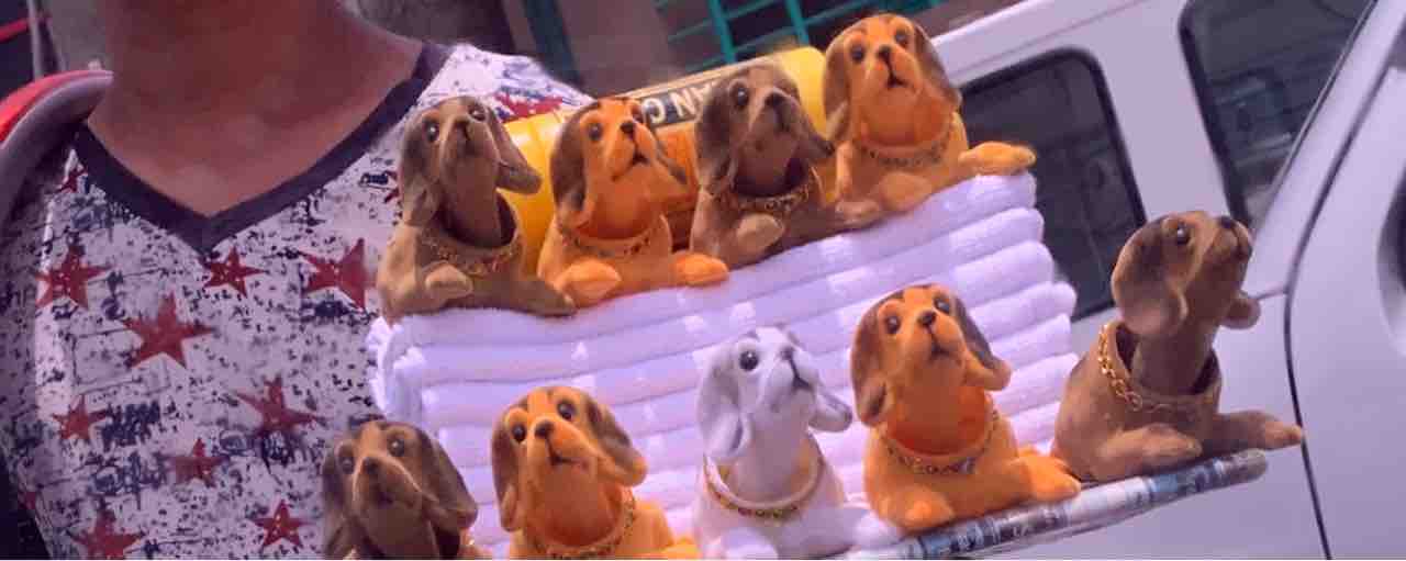 車に乗せると振動で首フリフリする犬の置物。