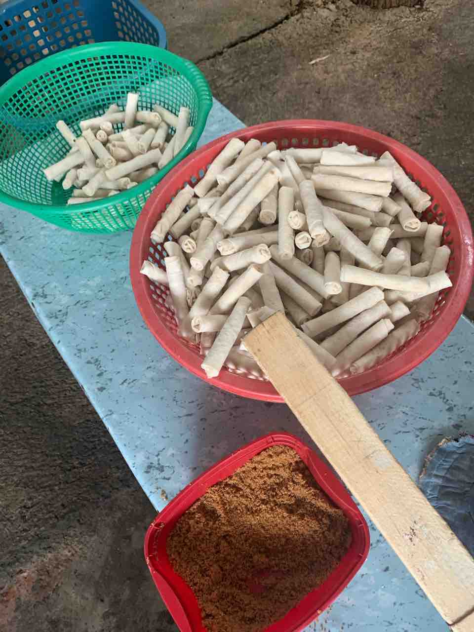 春巻き?かと思ったら赤い箱の中は黒砂糖みたい。