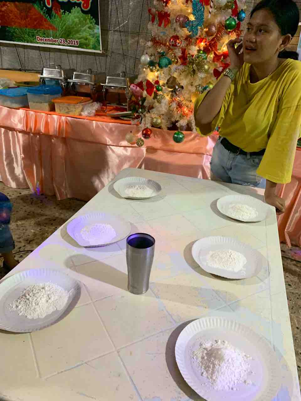 粉の中に隠れているコインを探し出し、隣のお皿に移す。先にすべてのコインを移し終わったチームが勝ち。