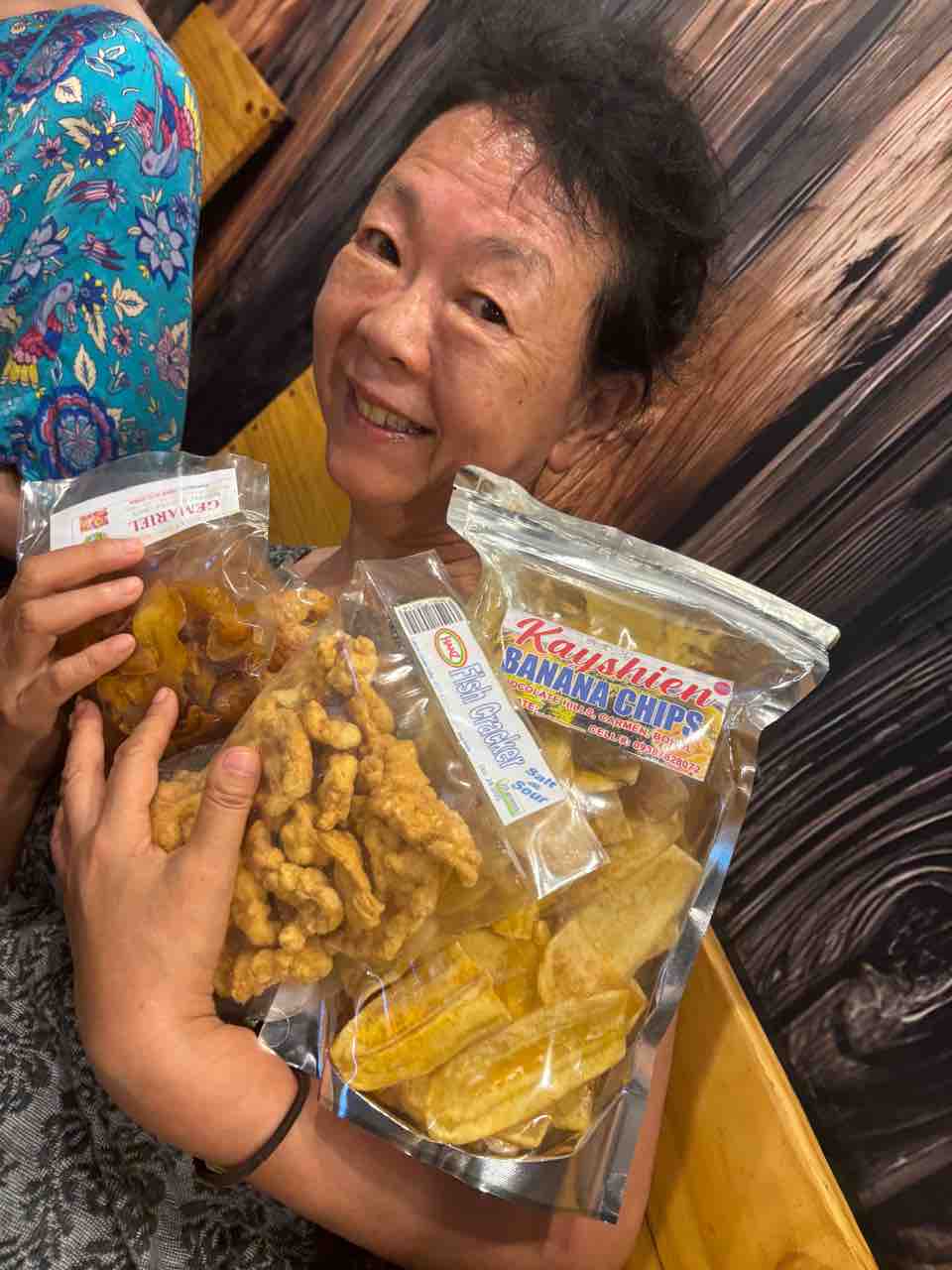 お土産の定番バナナチップと豚の皮揚げたやつを手に入れてご満悦。
